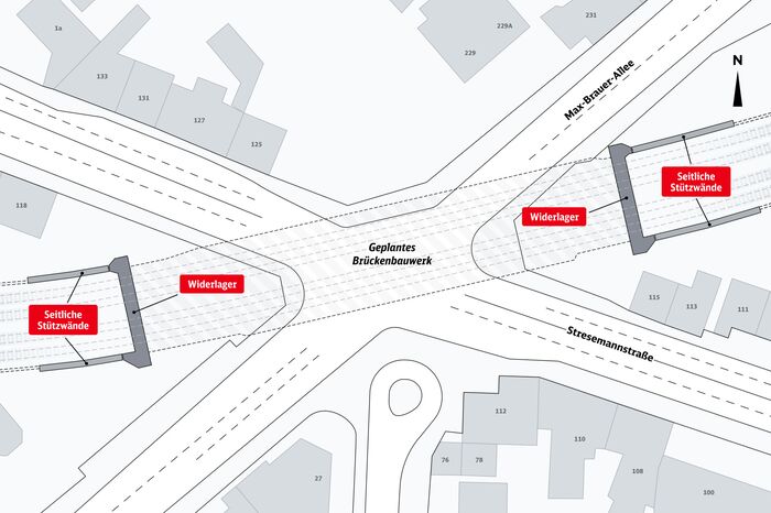 Mit Abschluss der Arbeiten an den Tiefgründungen nimmt das Projekt den nächsten Meilenstein in Angriff: den Bau der neuen Widerlager sowie der seitlichen Stützwände. Der Begriff Widerlager bezeichnet die beiden Stützbauwerke einer Brücke, die das gesamte Brückenbauwerk abfangen und die Lasten sicher in den Untergrund ableiten. Ähnlich wie die bestehende Brücke sind auch die alten Widerlager in den vergangenen knapp 100 Jahren durch den Zugverkehr und den damit einhergehenden Lasten stark beansprucht worden. Deshalb werden im Rahmen der Erneuerung der Eisenbahnüberführung komplette neue Widerlager hergestellt. Da in Abstimmung mit der Stadt Hamburg die neue Sternbrücke eine größere Spannweite aufweisen wird als die alte Brücke, werden die neuen Widerlager versetzt zu den bestehenden Bauwerken im Bereich der Kasematten errichtet. Dies wird später einen großzügigeren Raum unter der Brücke ermöglichen.