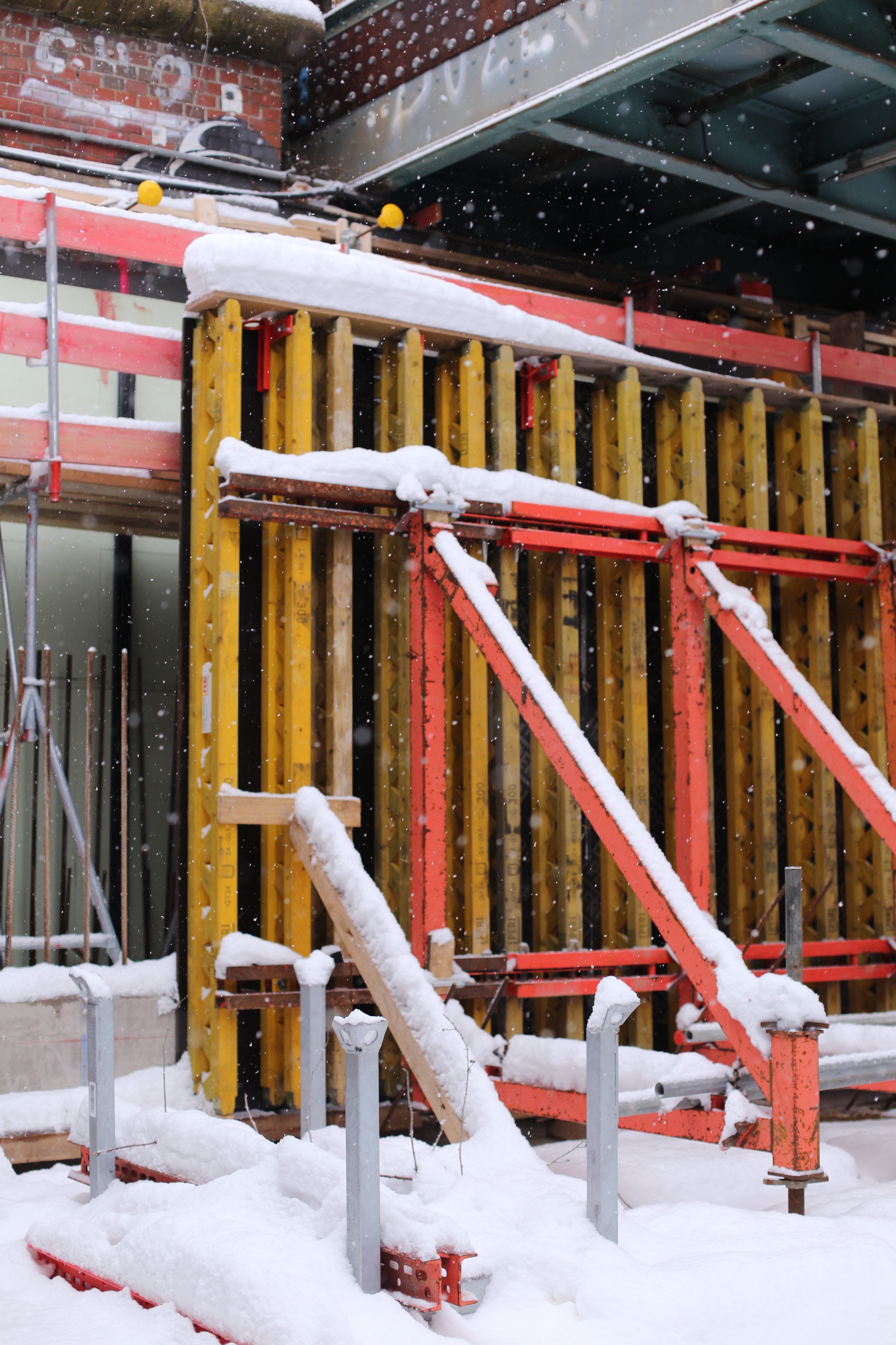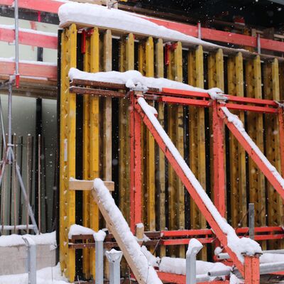 Gut sichtbar von der Straße arbeitet unsere Baufirma aktuell weiter mit Hochdruck an der Herstellung der neuen Widerlager, welche später die Lasten der neuen Brücke aufnehmen werden. Bevor betoniert werden kann, bringen die Arbeiter die Bewehrung (eine Konstruktion aus Stahlgittern) und die Verschalung an. Letztere sorgt dafür, dass der Beton die gewünschte Form annimmt beim Aushärten. Die Arbeiten an den Widerlagern werden noch bis voraussichtlich Ende Februar andauern.