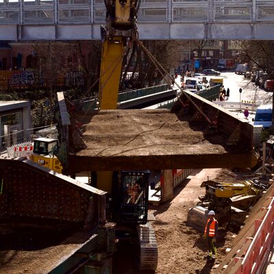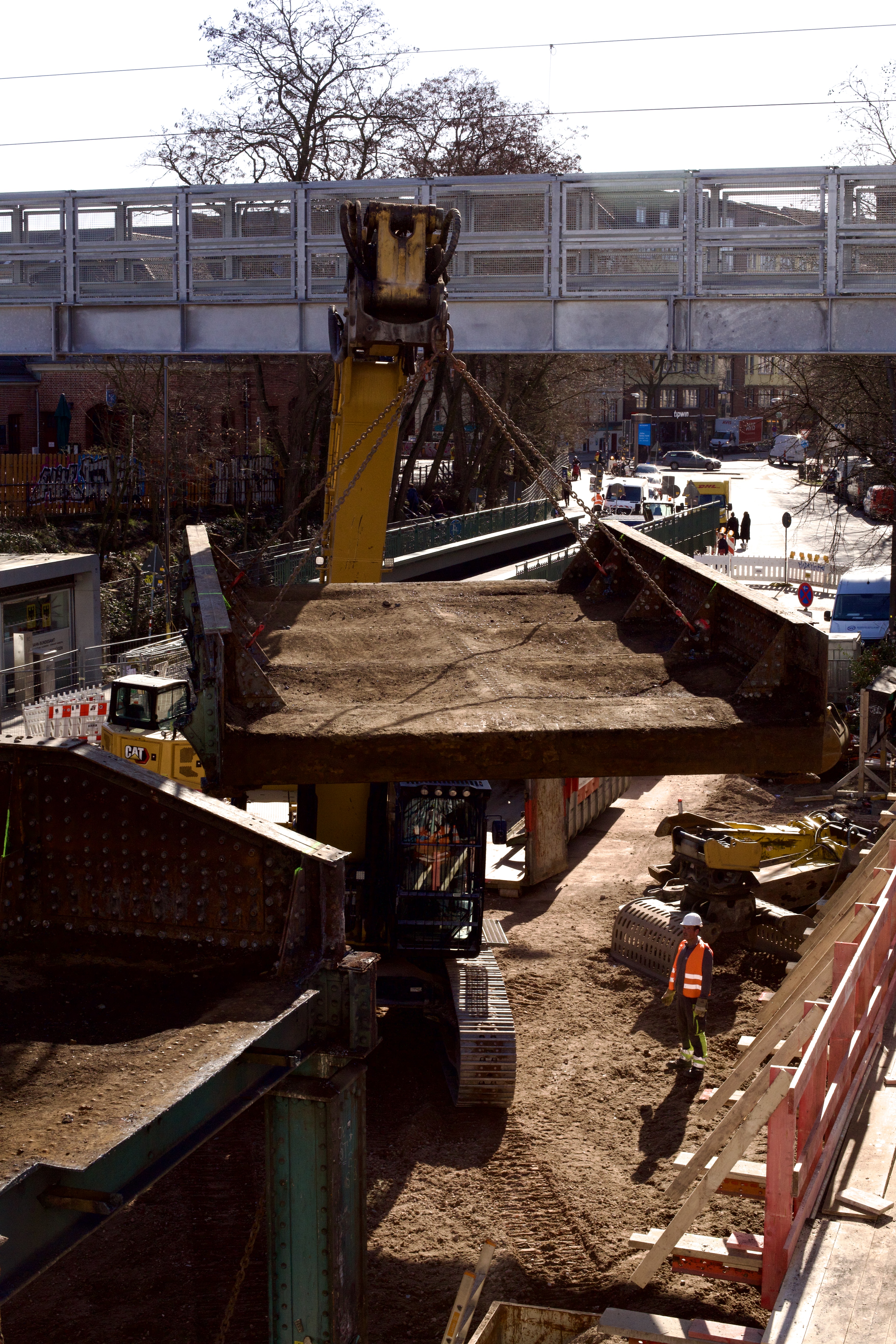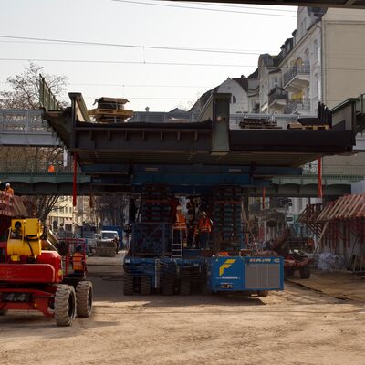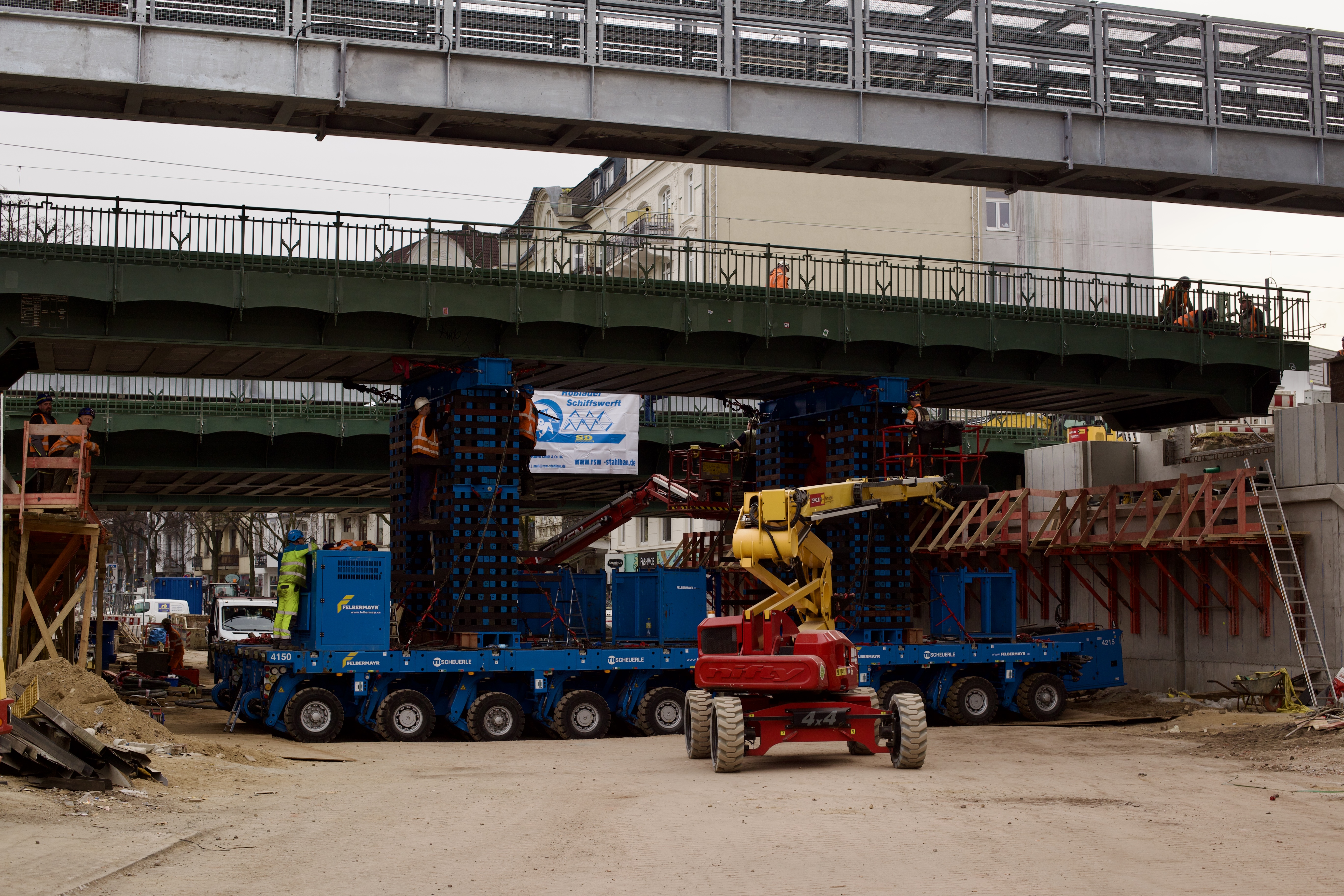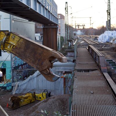 In den vergangenen Tagen hat sich an der Eisenbahnüberführung Schanzenstraße viel verändert. Nach intensiven Bauarbeiten konnte am Sonntag, den 8. März der letzte von drei neuen Überbauten eingehoben werden. Bevor die neuen Brücken eingehoben werden konnten, wurden zunächst die bestehenden, 120 Jahre alten Überbauten, abgerissen.