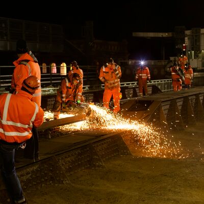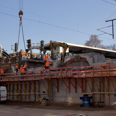 Nach dem Abschluss des Brückeneinhubs finden momentan sowohl unter der Brücke an den neuen Widerlagern, als auch im Gleisbereich abschließende Arbeiten zur Inbetriebnahme der neuen Eisenbahnüberführung statt.