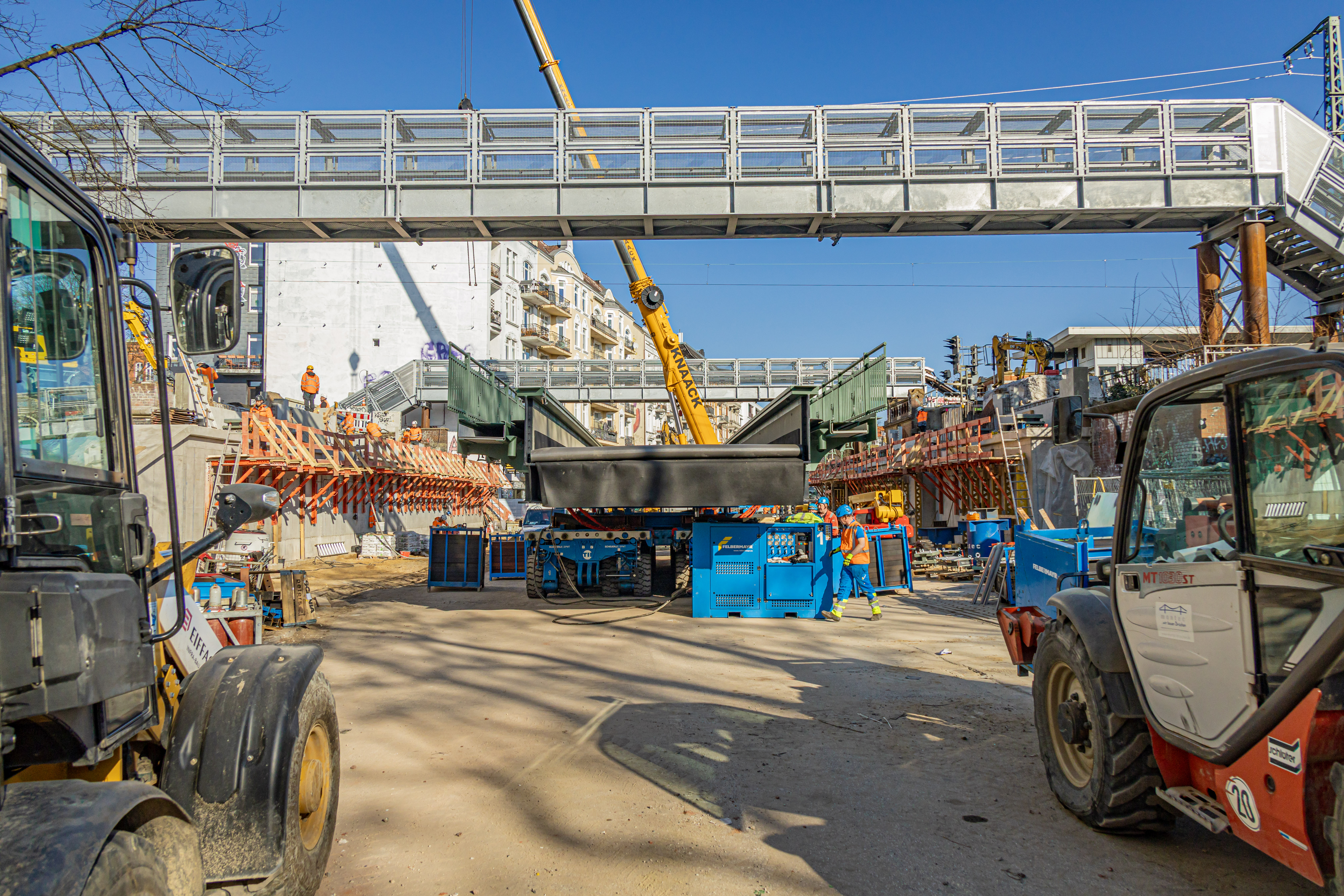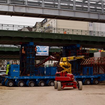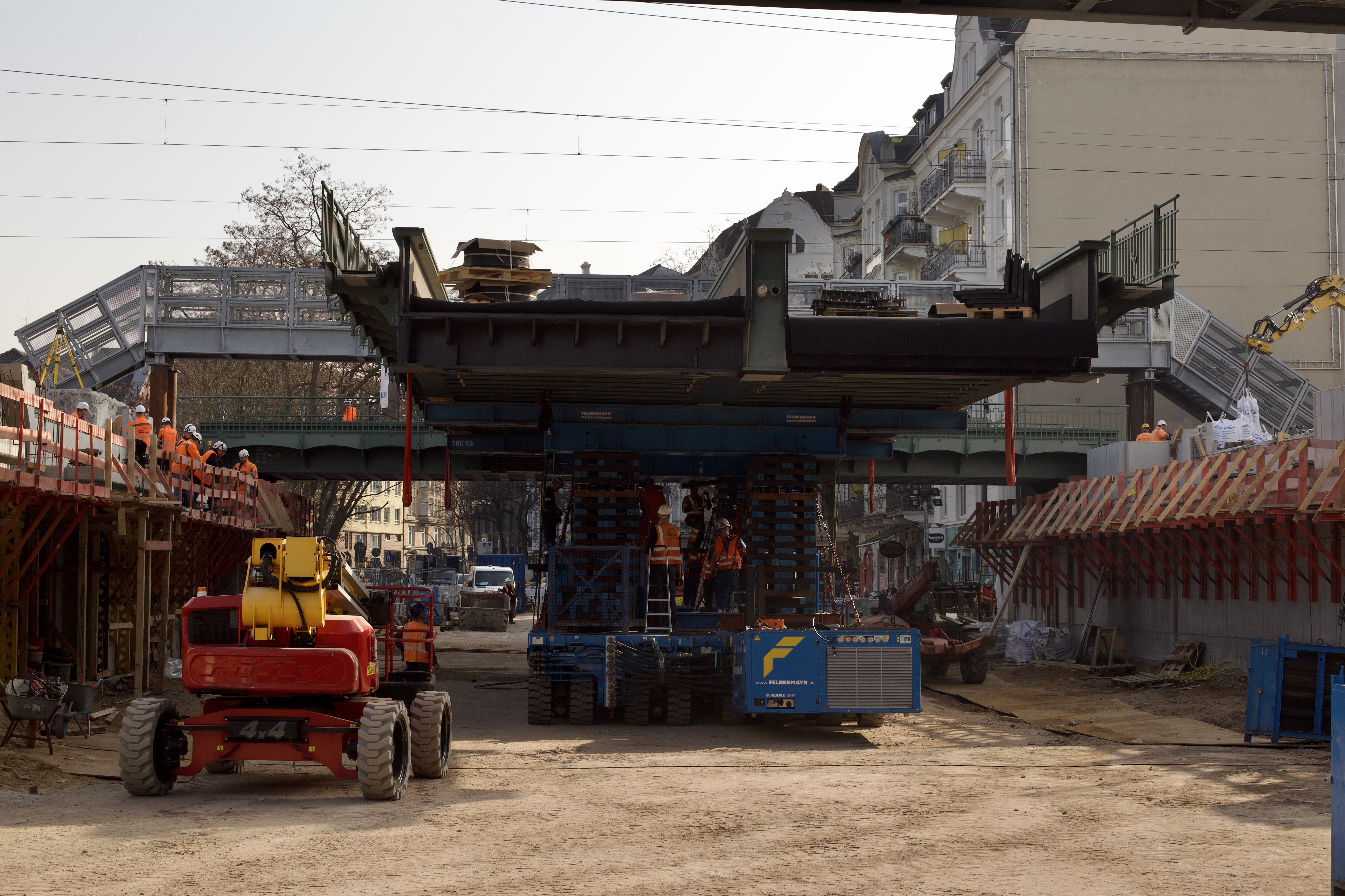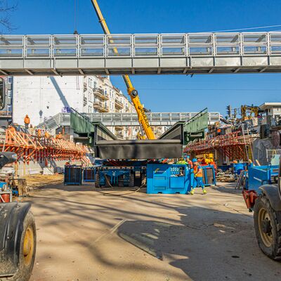Nachdem alle vier Brücken erfolgreich und nach Zeitplan abgebrochen waren, konnte bereits am Freitag, den 6. März früh morgens aus Süden der Einhub der Brücke für eines der Fernbahngleise vorbereitet werden.
