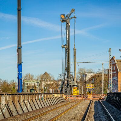 Im Januar hat die DB mit den Arbeiten zur Herstellung von Tiefgründungen an der Sternbrücke begonnen. Die Tiefgründungen sind notwendig, damit die Last der neuen Brücke sowie die zusätzlichen Belastungen durch den Eisenbahnverkehr sicher in den Boden abgeleitet werden können und die Standfestigkeit des Bauwerks somit sichergestellt ist.