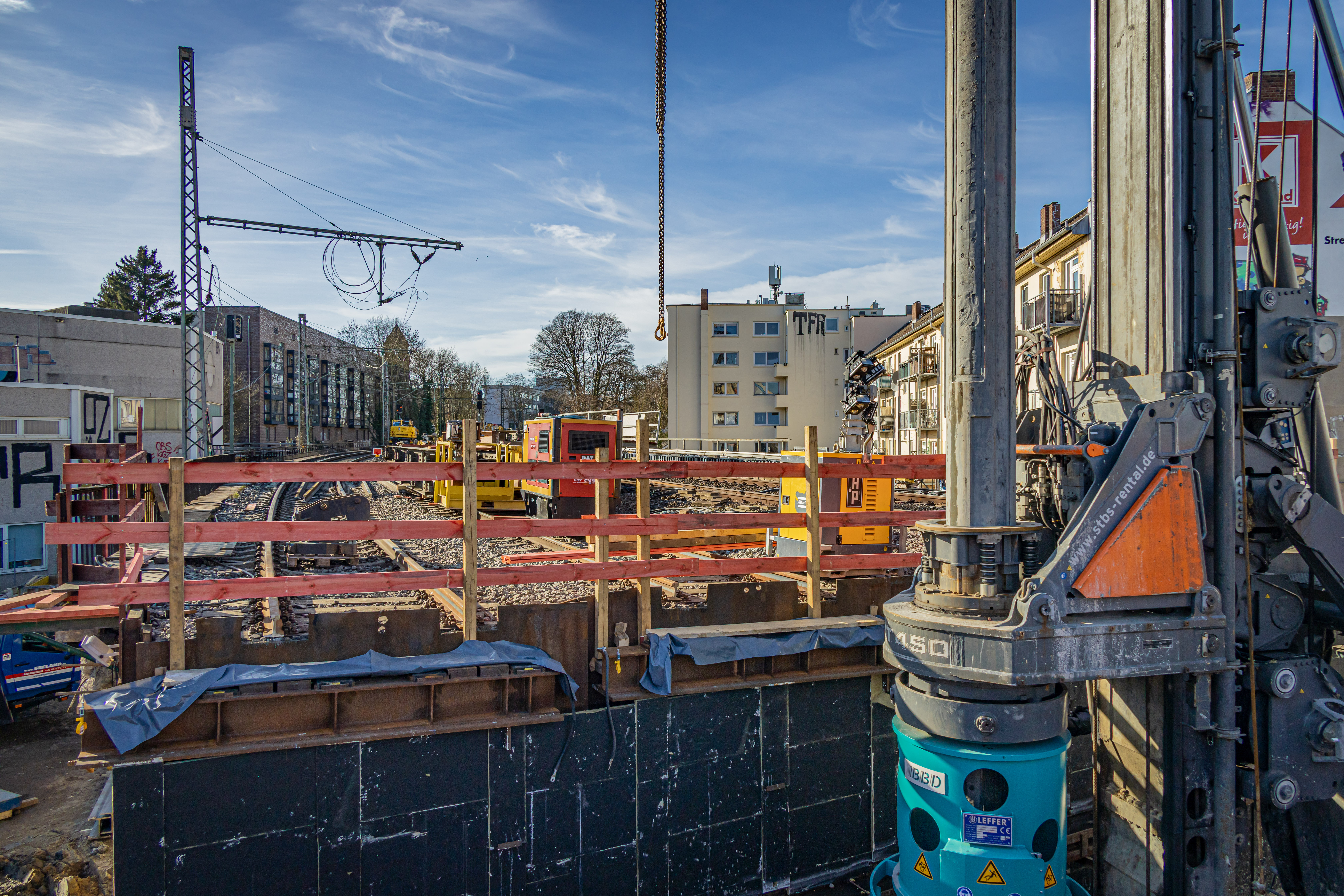 Nach Abschluss der Gründungsarbeiten im Bereich der Hilfsbrücken wird unser Bauunternehmen ab Ende März die noch ausstehenden Bohrpfähle im Bereich außerhalb der Gleise fertigstellen. Diese Arbeiten sollen bis zum 17. April abgeschlossen werden und finden sowohl tagsüber als auch nachts statt. Die Arbeiten konzentrieren sich dabei auf die beiden südlichen Baufelder 3 und 4. Anwohnende, welche aufgrund der nächtlichen Lärmimmissionen Anspruch auf Ersatzwohnraum haben, werden von uns separat per Brief kontaktiert. Sollten die Arbeiten vorzeitig abgeschlossen werden können, informieren wir auf unserer Website so zeitnah wie möglich. Im Zeitraum vom 3. April bis 6. April finden aufgrund der Osterfeiertage keine Bautätigkeiten statt.